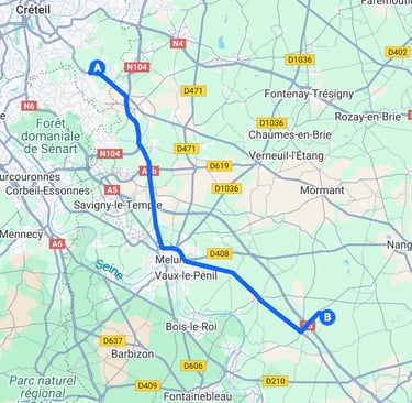 Arrivés en périphérie de Melun, prendre à gauche sur D1605 puis D605 direction Montereau/Vaux le Pénil