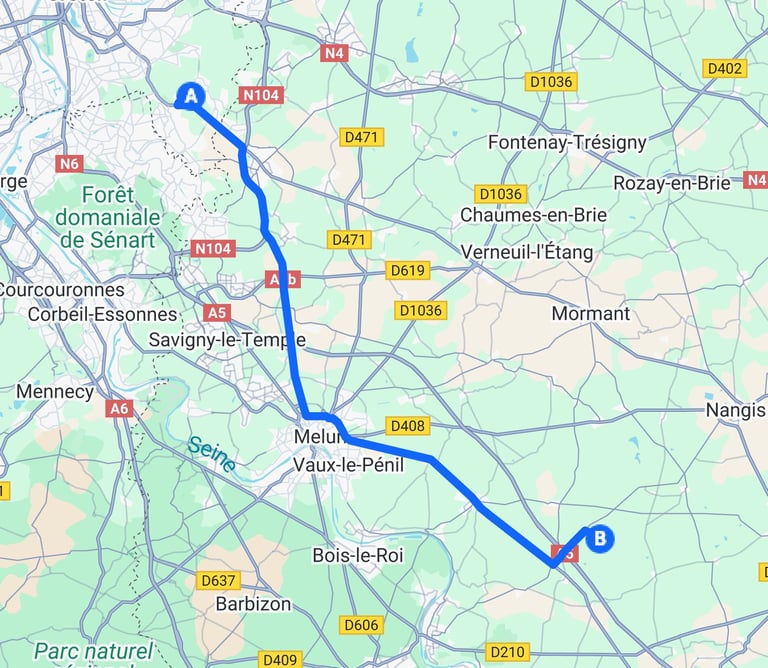 Prendre à droite sur la N104 direction Provins/Troyes/Melun